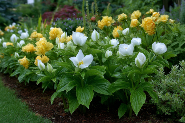 Другой великолепный вариант — купальница, или троллиус, чьи ярко-желтые и оранжевые махровые шары буквально светятся в сумраке, принося в тенистые уголки солнечное настроение. А для тех, кто хочет добавить в тенистый сад нотку экзотики, подойдет триллиум — редко встречающийся в культуре многолетник с крупными трёхлепестковыми цветками белого, розового или бордового оттенка. Его благородная красота и необычная форма цветка никого не оставят равнодушным.