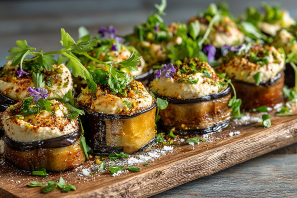 У чеснока срезаю верхушку, чтобы открылись зубчики, заворачиваю каждую головку в фольгу и запекаю при 200°C 40-45 минут до мягкости. Баклажаны нарезаю вдоль тонкими пластинками, обжариваю на оливковом масле с двух сторон до румяности, солю и выкладываю на бумажное полотенце, чтобы убрать лишний жир. Запеченный чеснок остужаю, выдавливаю зубчики из шелухи и отправляю в блендер. Туда же добавляю нут, тахини, лимонный сок, воду, соль, сумах и кайенский перец. Взбиваю до гладкой, кремообразной консистенции, при необходимости подливая ещё воды. На край каждого баклажанного ломтика выкладываю по ложке хумуса и аккуратно сворачиваю рулетиком. Выкладываю на тарелку швом вниз и убираю в холодильник минимум на час перед подачей.