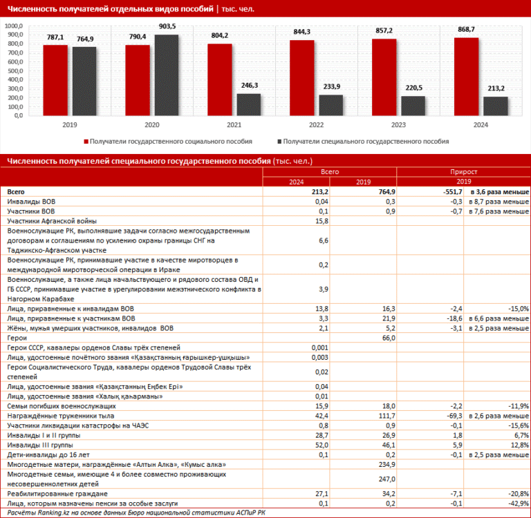 Действительно, по расширенной таблице со всеми категориями получателей специального государственного пособия видно, что в 2019 году среди них не было категории «участники Афганской войны», а в 2024-м она есть, и к ней относятся 15,8 тыс. человек. Они получают ежемесячную выплату в размере 22,9 тыс. тг. Эта новая категория была включена в число получателей в 2021 году. Помимо ветеранов-афганцев, с 2021-го на пособие также смогли рассчитывать военнослужащие РК, охранявшие границу на Таджикско-Афганском участке, участвовавшие в миротворческих операциях в Ираке и Нагорном Карабахе. Тут действительно могут возникать вопросы, и эта ситуация также нуждается в пристальном рассмотрении и оценке.
