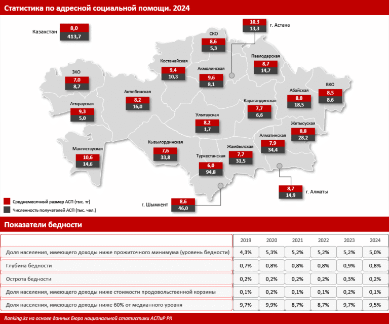 В то же время следует помнить: АСП — одно из самых небольших пособий. Среднемесячный размер АСП в 2024 году в разных регионах составлял лишь от 6 тыс. до 10,6 тыс. тг. Этих денег едва хватит, чтобы один раз сходить в магазин за продуктами, и точно недостаточно для того, чтобы прожить месяц человеку без работы. Можно ли отнести это пособие по бедности к способам обогащения? Если это так, логично было бы видеть в статистике резкое сокращение показателей этой самой бедности. Однако, как показывают данные БНС, с 2019 по 2024 год доля населения, имеющего доходы ниже прожиточного минимума, не уменьшилась, а даже немного выросла: с 4,3% до 5%. Другие индикаторы бедности за этот период почти не изменились: глубина бедности в прошлом году составляла 0,8%, острота — 0,2%.