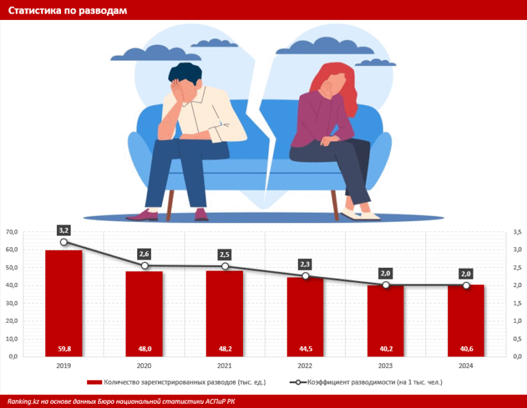 Начнём с самого обсуждаемого аргумента: из-за появления в стране пособия для неполных семей в РК якобы увеличилось количество разводов. К счастью, Бюро национальной статистики (БНС) АСПиР РК своими данными опровергает это утверждение. Судя по отчётам БНС, за последние несколько лет число разводов в стране не выросло, а, наоборот, сократилось. Если в 2019-м через процедуру расторжения брака прошли 59,8 тыс. пар, то в прошлом году — уже всего 40,6 тыс. Коэффициент разводимости также уменьшился.