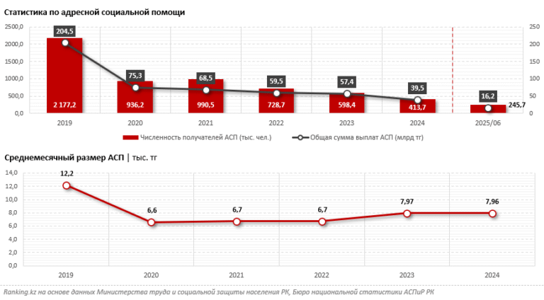 Впрочем, здесь как раз видна позитивная динамика: по данным МТСЗН РК, с 2019 по 2024 год численность получателей АСП сократилась в 5,3 раза, с 2,2 млн до 413,7 тыс. человек. Общая сумма выплат за этот период уменьшилась с 204,5 млрд тг до 39,5 млрд тг в год. В январе–июне текущего года численность получателей АСП составила всего 245,7 тыс. человек, а общая сумма выплат — 16,2 млрд тг. Такая большая разница объясняется тем, что за эти годы система назначения АСП трансформировалась: был введён тот самый фактор обусловленности. Именно благодаря этим инструментам пособие для самых бедных было изменено так, чтобы перекрыть все лазейки для социального иждивенчества.