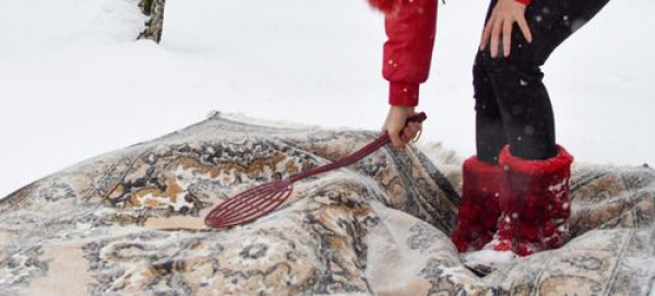 Расстелите ковер ворсом вниз на чистом снегу. Начинайте выбивать по изнанке. Так вся глубокая пыль вылетит из ковра и останется в снегу.