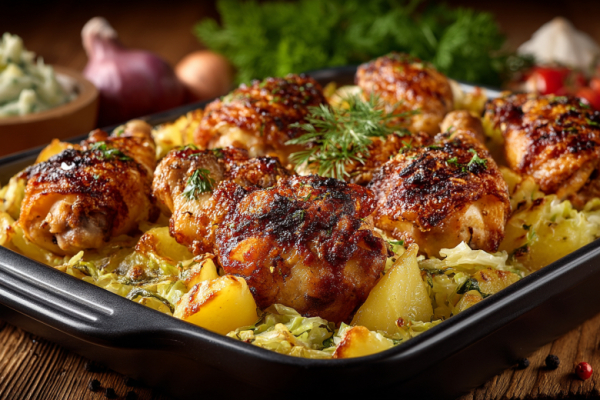 Принцип прост: все ингредиенты томятся на одном противне, пропитываясь соками друг друга и специями. Вкус получается глубоким и домашним: сладость карамелизированных овощей, насыщенность курицы и тёплые ноты специй.