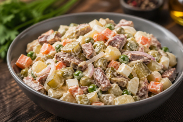 Если привычный оливье уже кажется слишком предсказуемым, этот вариант приятно удивляет. Здесь больше насыщенности за счёт обжаренного мяса.