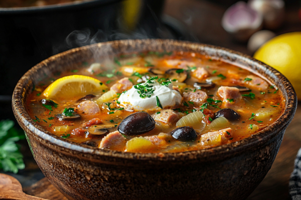 Для приготовления вам понадобится: 300-400 г смеси мясных продуктов (говядина, ветчина, копченые ребрышки), 1 луковица, 2-3 маринованных огурца, 2 столовые ложки томатной пасты, по 2 столовые ложки каперсов и оливок без косточек, немного растительного масла для жарки, лавровый лист, соль, перец горошком и лимон для подачи. Сначала сварите крепкий бульон на мясе и костях. Отдельно на растительном масле обжарьте мелко нарезанный лук до прозрачности, добавьте нарезанные соломкой огурцы и томатную пасту, тушите 5-7 минут. Влейте в эту пассеровку пару половников бульона, чтобы соус получился гладким, и отправьте всё в кастрюлю с бульоном и нарезанным мясом. Добавьте каперсы, оливки, лавровый лист и специи, дайте супу покипеть на медленном огне 10-15 минут. Подавайте с долькой лимона и сметаной.