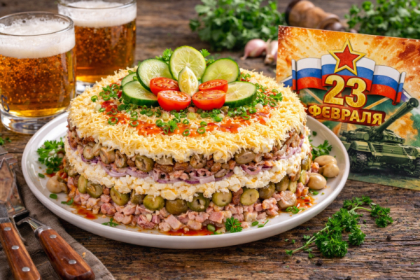 Этот салат — настоящий хит для мужского праздника. Сытный, копчёный, с грибами, сыром и пикантной ноткой сладкого чили. Получается мощный и очень «мужской» салат — идеальный вариант для 23 Февраля. Съедается первым и всегда просят добавку. Слои пропитываются, вкус становится насыщенным, а соус сладкий чили добавляет лёгкую остроту и делает салат ещё интереснее.